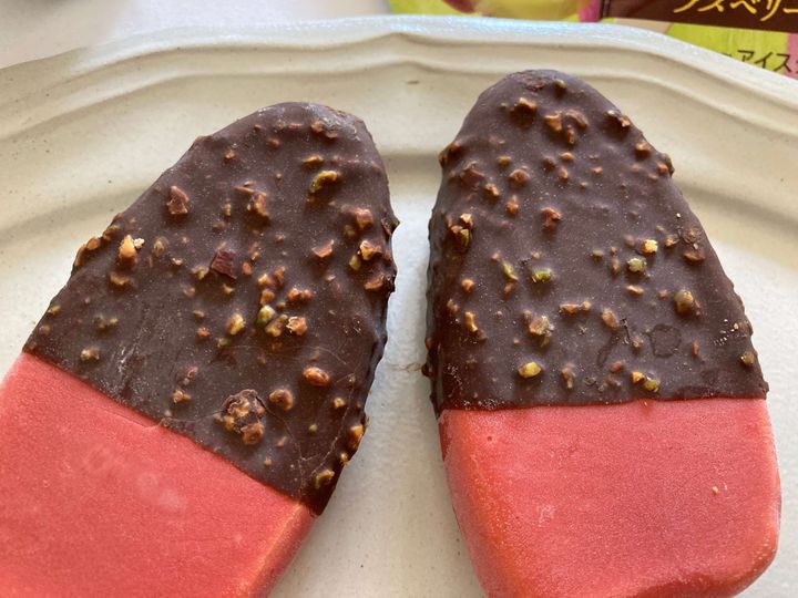 ピスタチオペースト入りのコク深くなめらかなアイスに、甘酸っぱいラズベリーチョコの外側に、香ばしいクラッシュピスタチオ入りの濃厚なセミスイートチョコをコーティングしたアイスクリームバーです。
