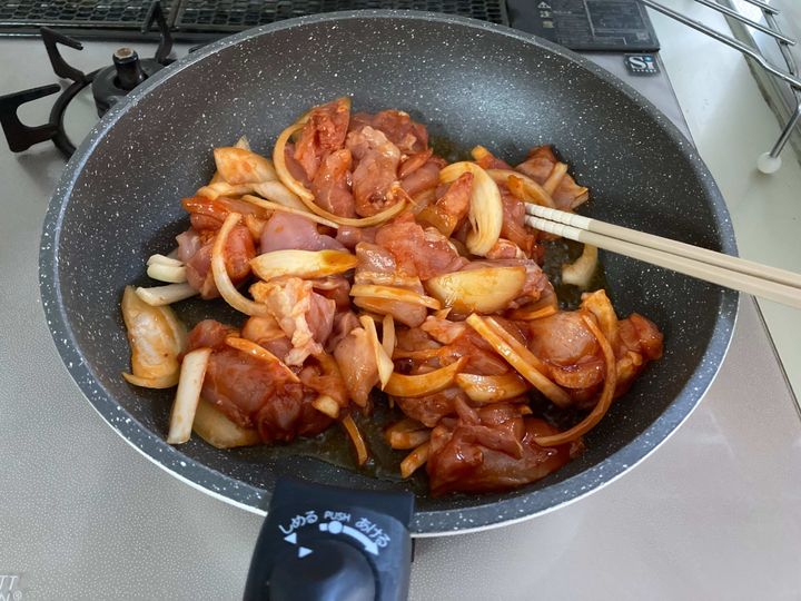 フライパンに油をひき、下味をつけた鶏肉と玉ねぎを炒めます。