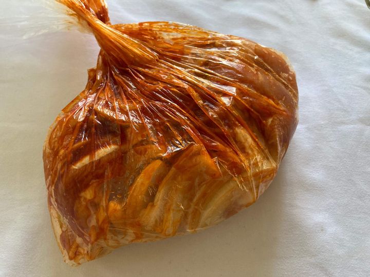 作り方は、一口大に切った鶏肉と薄切りにした玉ねぎをビニール袋の中に入れて、タッカルビの素を入れもみ込み下味をつけます。