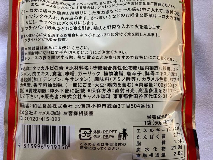 こちらの商品は50gのタッカルビの素が2袋入っています。