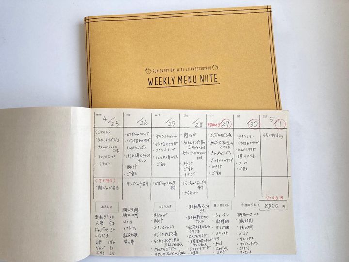 献立ノートを活用して冷蔵庫や家にあるものを書き出し、食品ロスを防ぐためにあるものを優先的に活用した献立をたてます。