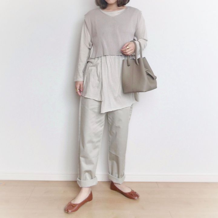 ショート丈のベストを合わせることでスタイルアップ効果も抜群です。