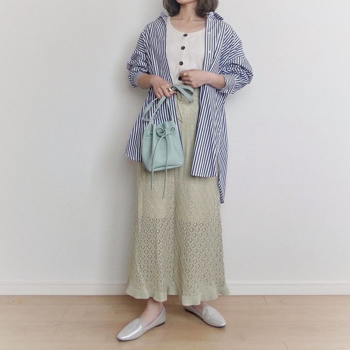 トレンドのニットビスチェと合わせればトレンドコーデの完成です。