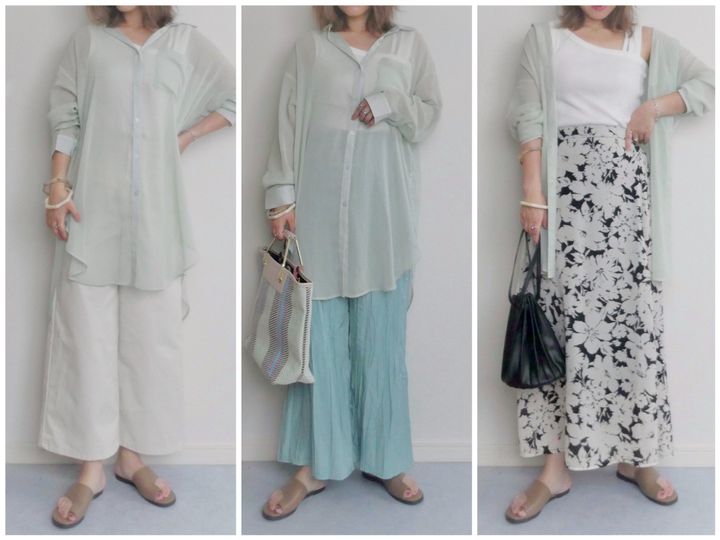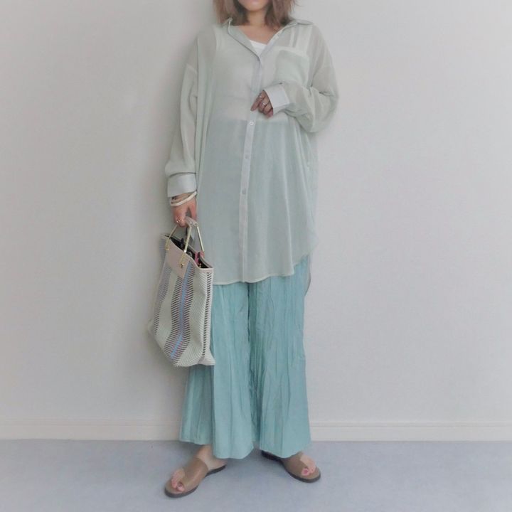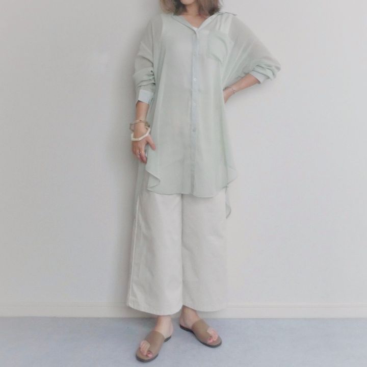今年トレンドのシアー素材のロングシャツで