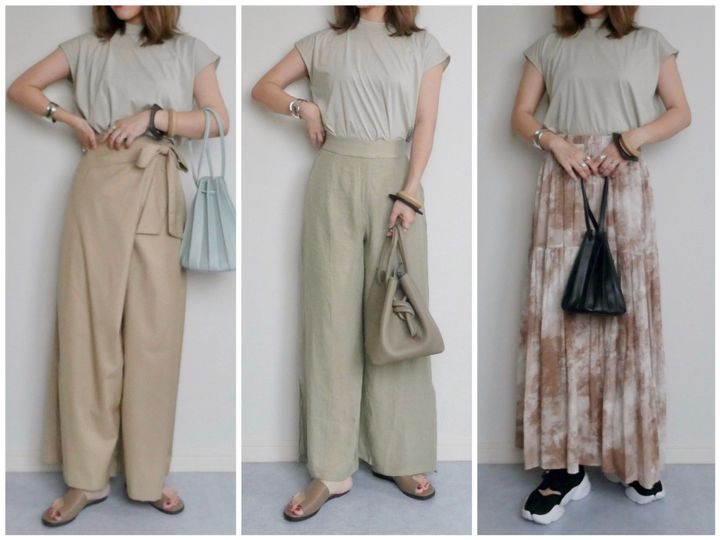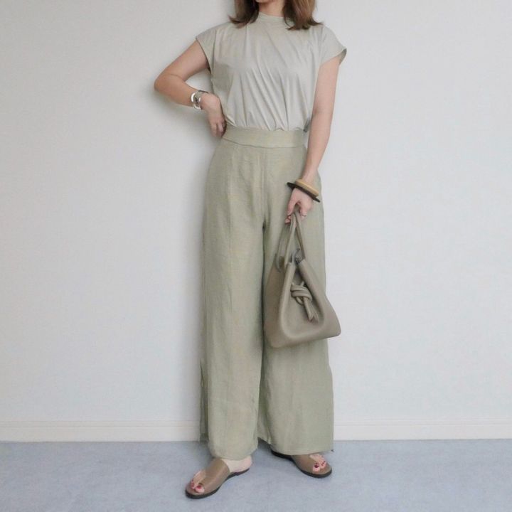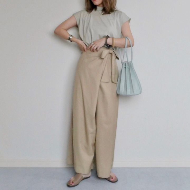 今や定番とも言えるベージュパンツとの相性もバッチリ。