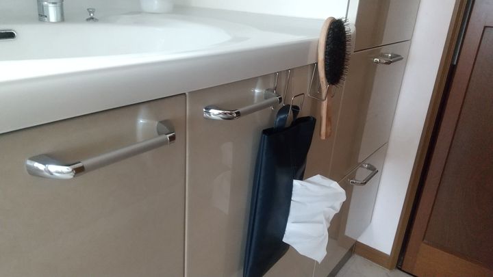 我が家では洗面台の扉に設置し、ティッシュとヘアブラシを引っ掛け収納にしています。