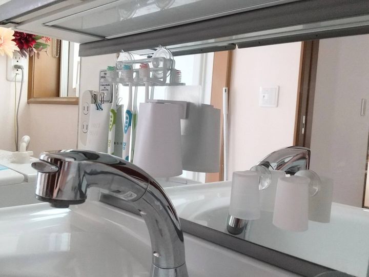 「水切れがいいマウスウォッシュ用コップ」を洗面台の鏡に設置しました。
