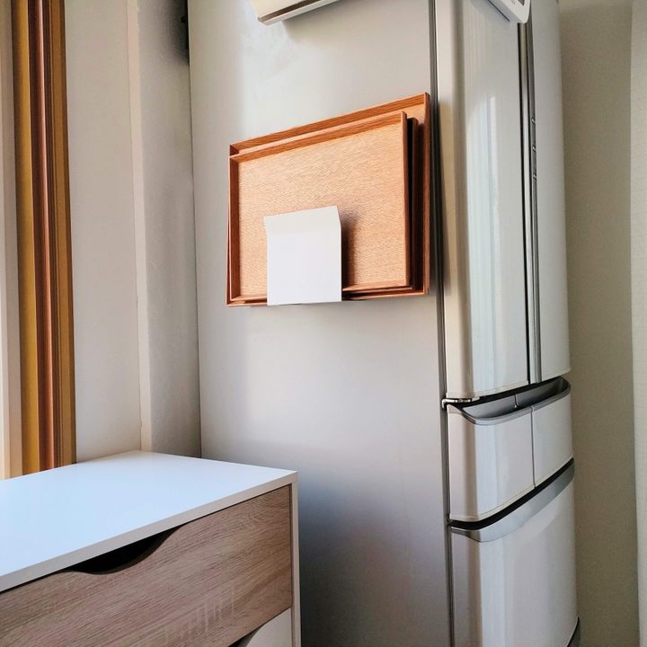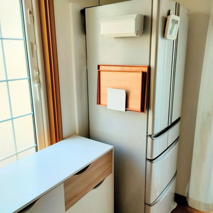 さっそく冷蔵庫のサイドに設置してみました。マグネットでピタッと貼り付けるだけなので設置は一瞬で完了!