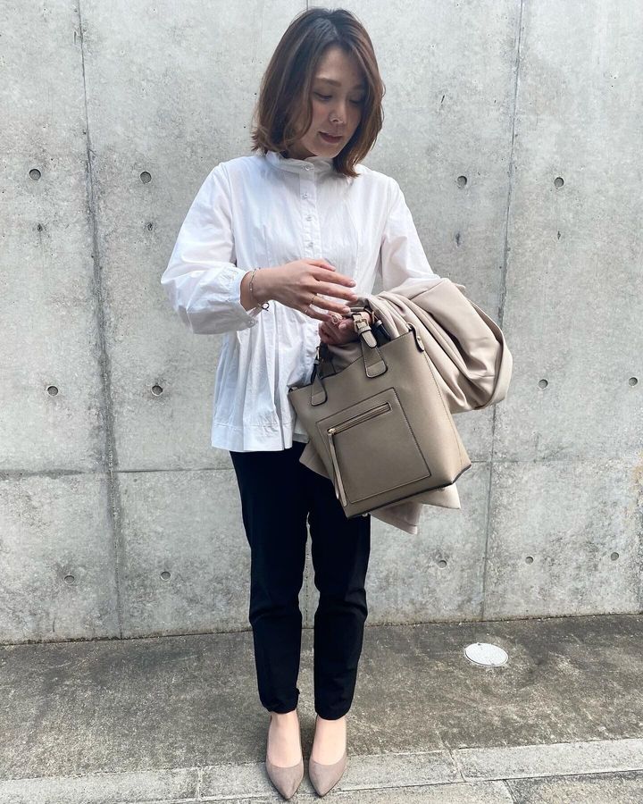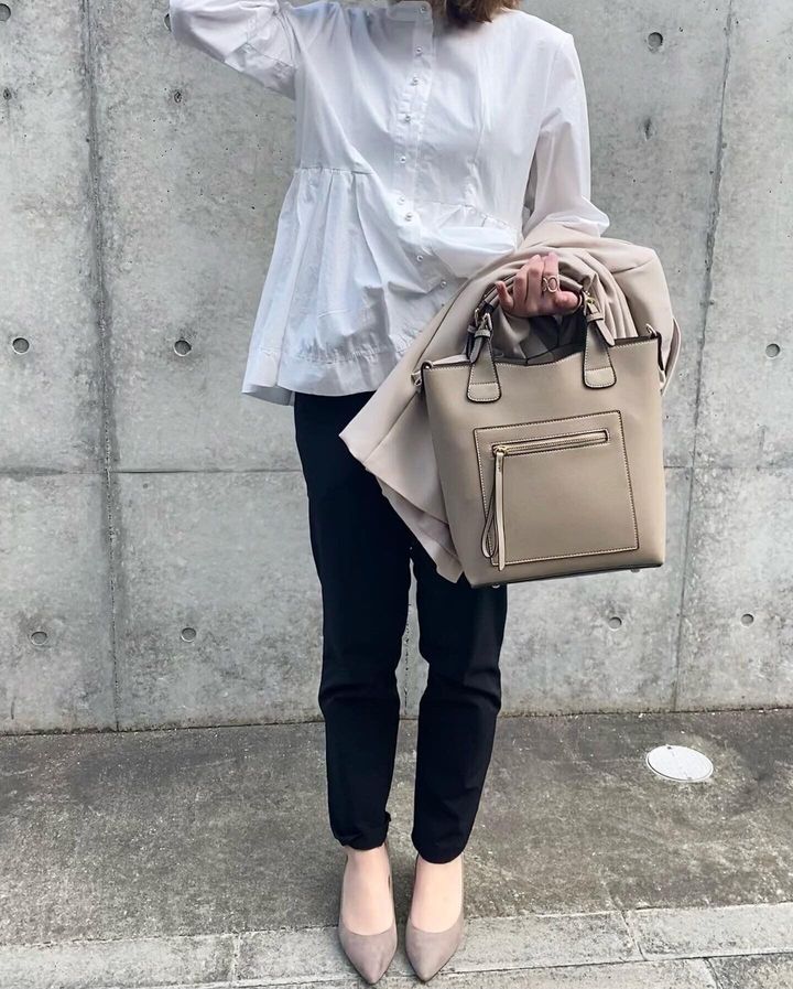 靴とバッグの色味を合わせると全体のバランスが良くなります。バッグは、最低でもこのくらいの大きさは欲しいところ、カメラや書類など意外と荷物が多くなります。小さなバッグの際はサブバッグを持っていくのがおすすめ。その時に、サブバッグもコーディネートに合うものを選ぶといいと思います。