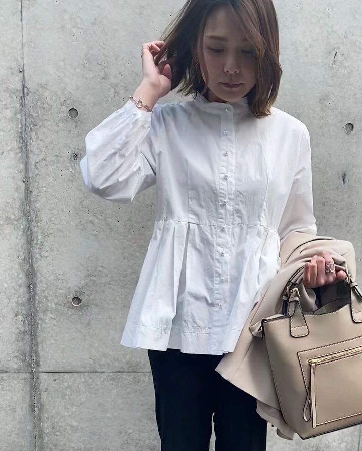 シャツはデザインシャツがおすすめ。私が着ているものはボタンがパール、ウエストから切り替えになっており裾はフレアです。甘めのデザインですが、スタンドカラーなのでハンサム要素もあり、大人女子でも着られるデザインシャツです。このシャツがベーシックなものだと物足りなさを感じるので、着るだけで満足度が高いデザインシャツがおすすめです。デニムと合わせれば普段着としても活躍してくれます。