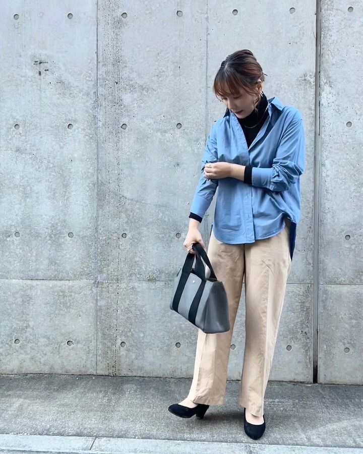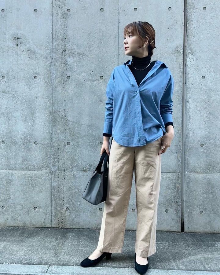 お袖に重なった黒のタートルネックとパンプスの黒がリンクして、全体のバランスが良くなります。身幅のあるシャツを重ねているので気になる腰回りもカバーしてくれます。