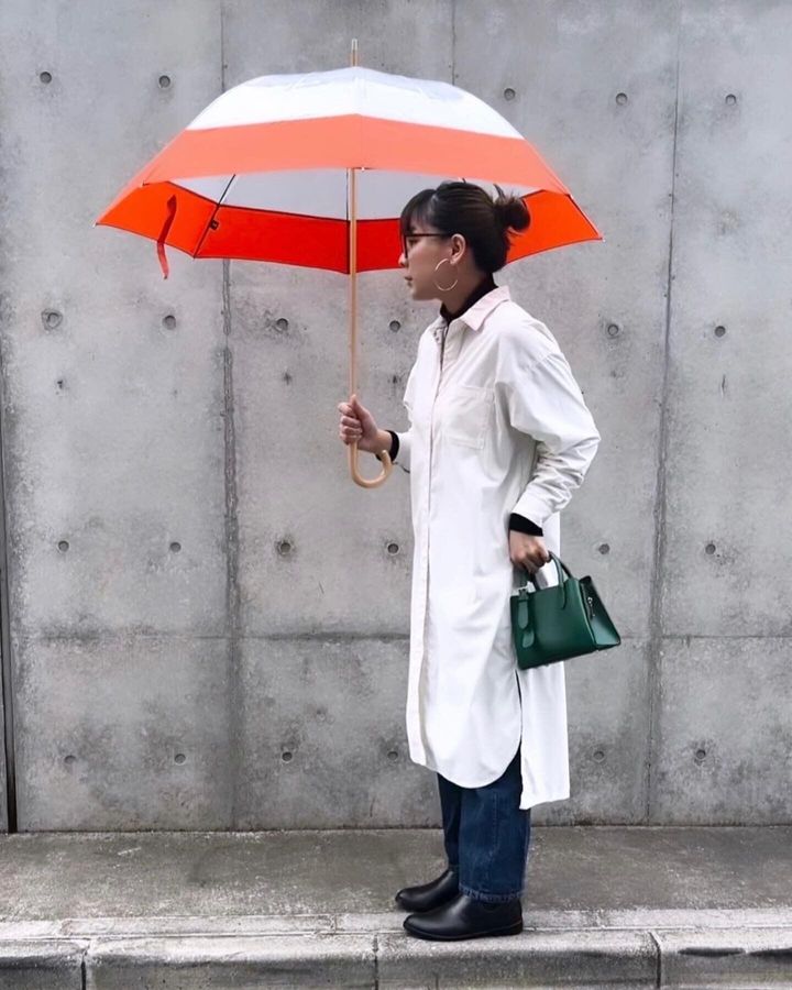 シャツワンピースで雨の日スタイル。タートルネックTシャツとデニムを重ねています。実はサイドゴアブーツは、レインシューズです。長靴ぽくないものだと出先で雨が止んだ後もチグハグにならなくて済むから安心。傘のオレンジが差し色になります。