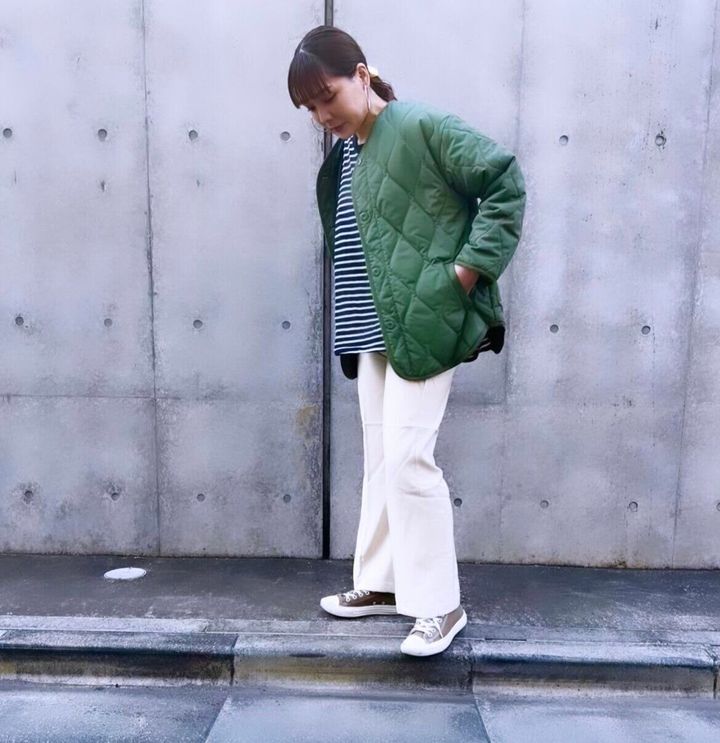 ベージュ×グリーン。ハッと目をひくグリーンが主役のスタイリング。落ち着きのあるベージュと合わせることでいい塩梅で目出させることができます。コートと合わせたコンバースのベージュがバランサーの役割に!