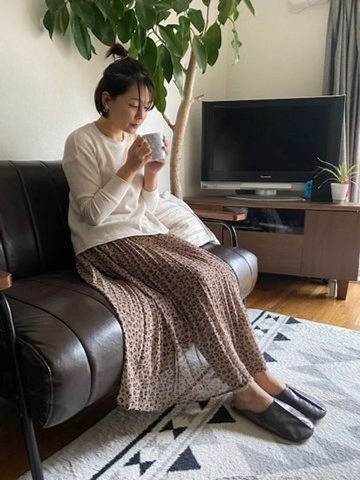 ワッフル生地のカットソーや総ゴムのスカートで着ていてリラックスできるスタイリングです。