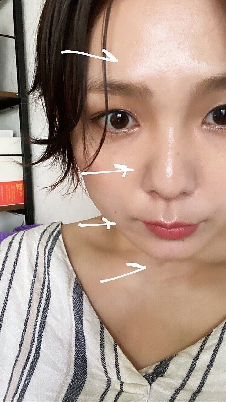 おでこから鼻にかけてのTゾーン、唇の上、あご先、に入れます。