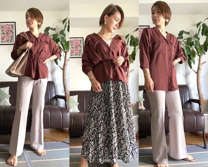 真ん中:フェミニンなボウタイブラウスを合わせれば、即お出かけ仕様に。
