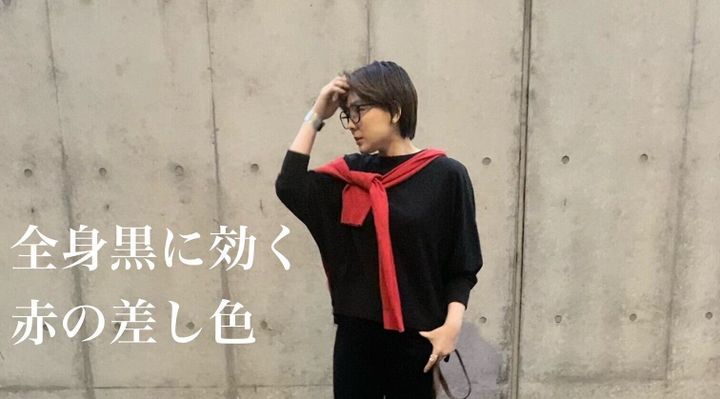 赤いさし色はどの年代においてもお洒落見え度200%のテクニックです。