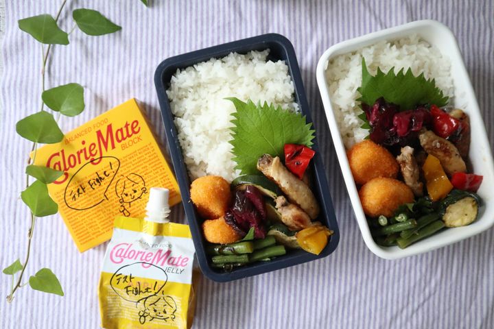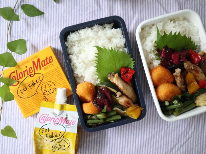 お弁当を気合入れて1人2個とか作っても、ペロリの時もあれば食べきるのがキツイときもあるようなので、お弁当を1個作ってあとはカロリーメイトで調整。