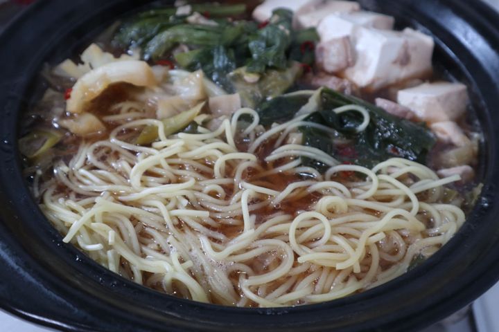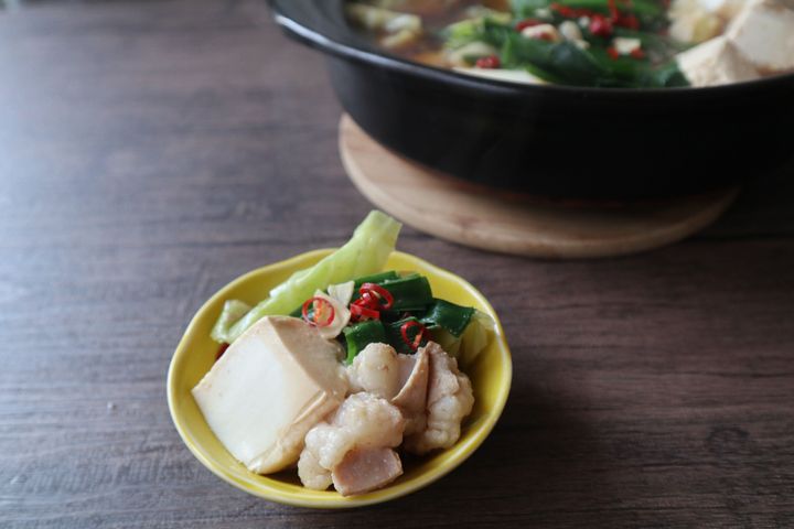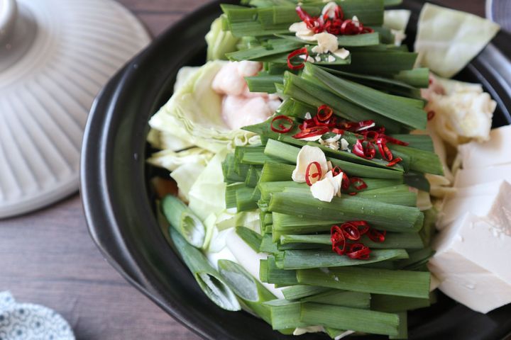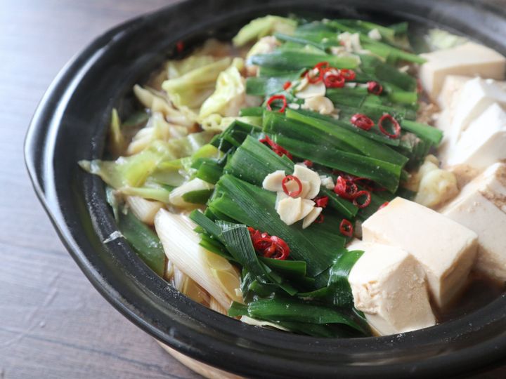 土鍋に、鍋つゆ、もつ、野菜などを入れて、火にかけて、火が通ったら食べられるのでとっても簡単で手軽。