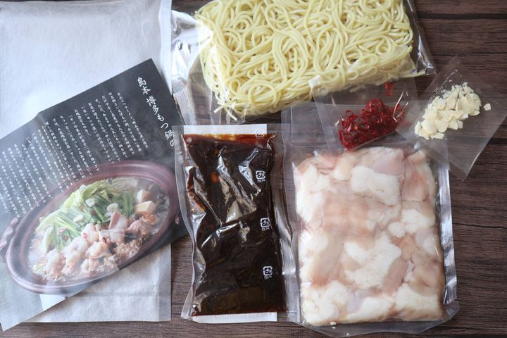 国産牛もつ、鍋つゆ、ちゃんぽん麺、にんにく、鷹の爪がついてきます。