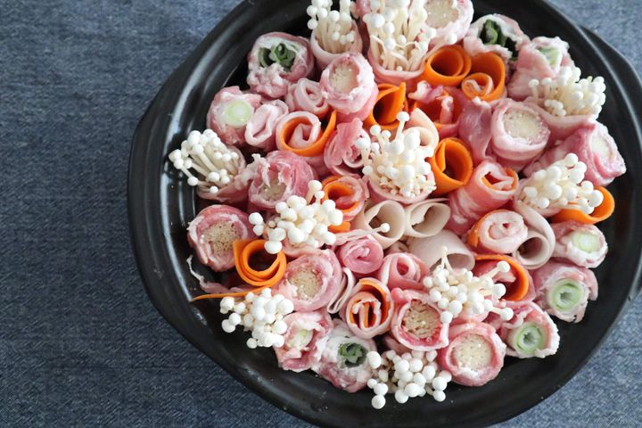 野菜とお肉のくるくる鍋の完成。あれば小ねぎを散らすと彩がよくなります。
