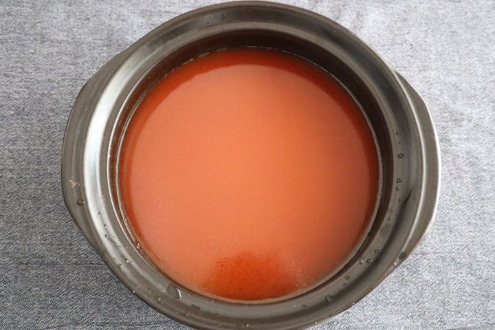 土鍋に鍋つゆを入れます。写真はキムチ鍋つゆを4人分入れています。