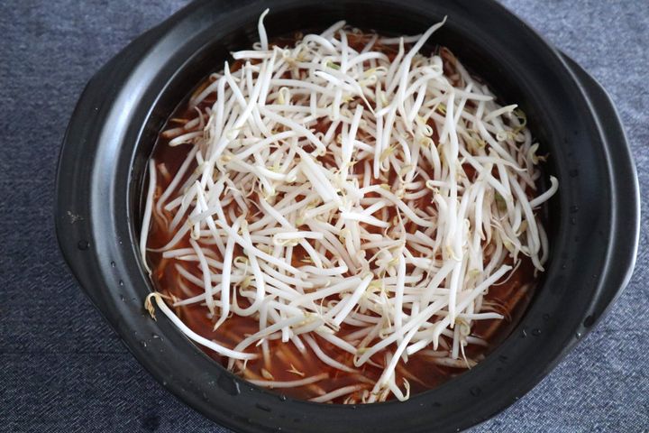モヤシを2袋たっぷりいれます。かさまし&土台にもなります。