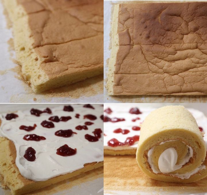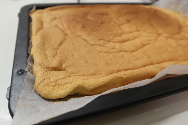1. スポンジケーキにケーキシロップを塗る。スポンジケーキの片方の端だけ斜めに切り落とす。(ロールケーキの巻き終わりになります)。長い辺を両方とも切りそろえる。幅を約10㎝、約6cm、約4cmに切る(長さは目安なのでお好みの幅で大丈夫です。)(写真参照)