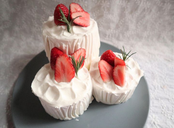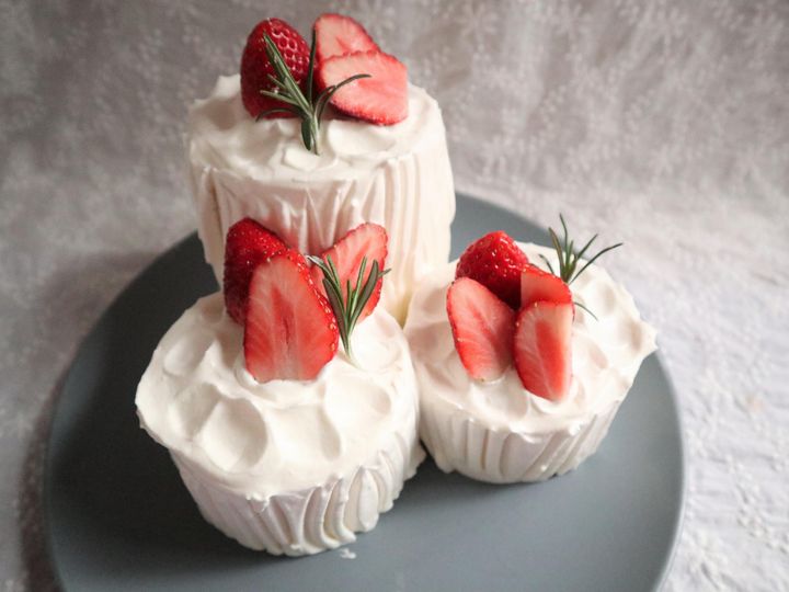 プレートに3つ盛りつけ、いちごとローズマリーをトッピングする。ふわっとしたクリームにしっとりスポンジがとても美味しいです。軽くてぺろっと食べてしまいます。