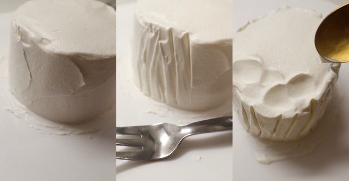 全体に厚めにホイップクリームを塗り、側面をフォークで表面をスプーンで模様をつける。(写真参照)綺麗にホイップクリームがぬれなくても模様をつけてしまうので、大丈夫です!なのでなので、ケーキ作り初心者でも誤魔化しがきくので挑戦しやすいケーキです。