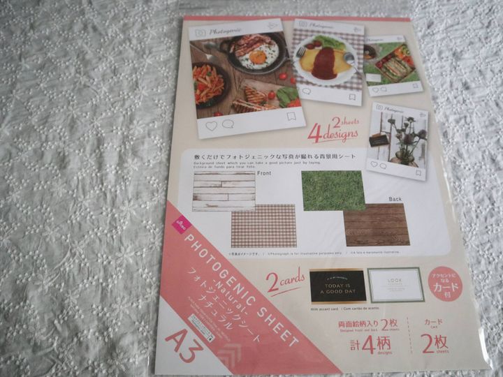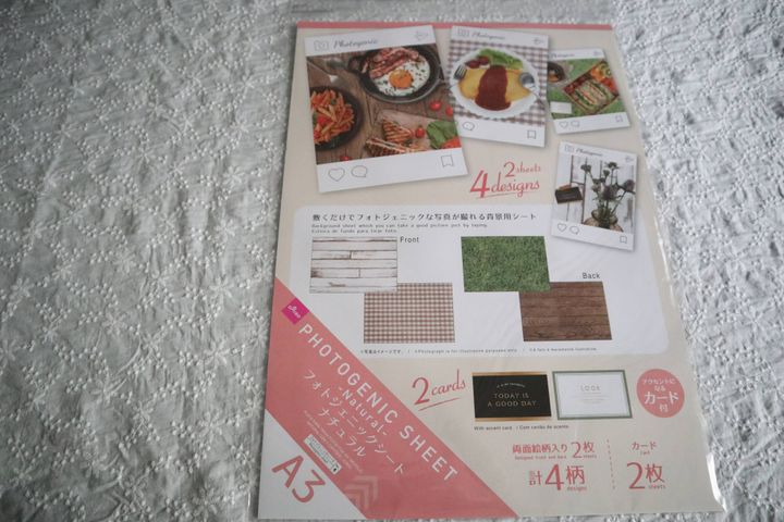 ダイソー《フォトジェニックシート ナチュラル》110円(税込)。SNSに投稿するようのお洒落な写真を撮る時に活躍するアイテムです。サイズはA3。物撮りする時には十分なサイズです。柄は4種類。アクセントになるカードも2枚入っています。
