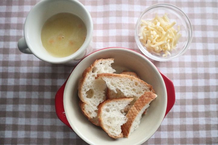 バゲット3切れをグラタン皿にちぎって入れる、その上にお湯で溶いたコーンスープ1食分をかけてピザ用チーズ(お好みの量)をのせて、トースターでチーズがこんがりするまで焼いたら完成です。