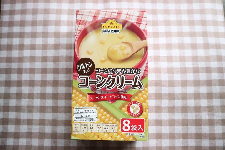 今回使ったのはイオントップバリュのベストプライス[クルトン入りコーンのうまみ豊かなコーンクリーム]8袋入り194円(税込)1食当たり約24円です。コスパもいいですね!