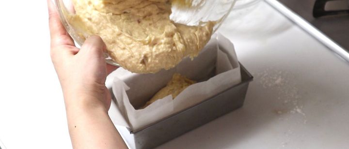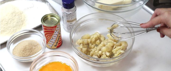 ボウルにバナナを入れて、泡だて器で軽くつぶします。