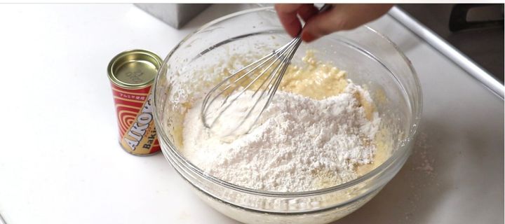 3.Aを2に加えて泡だて器に持ち替えて混ぜる。混ぜすぎ注意。