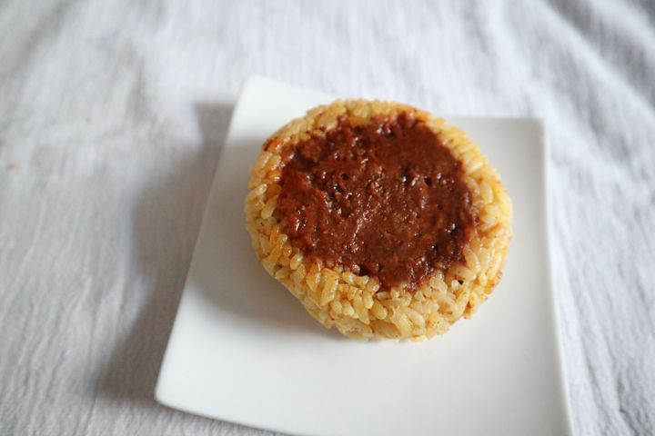 スパイシーカレーの上に卵黄、粉チーズをトッピング。