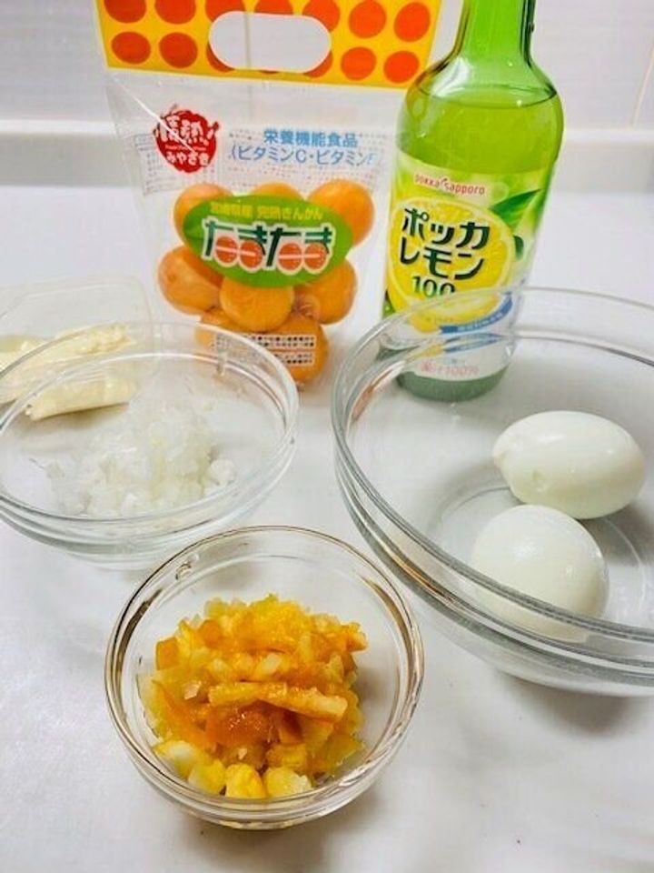 1.ボウルにゆで卵を入れ、フォークで潰す。