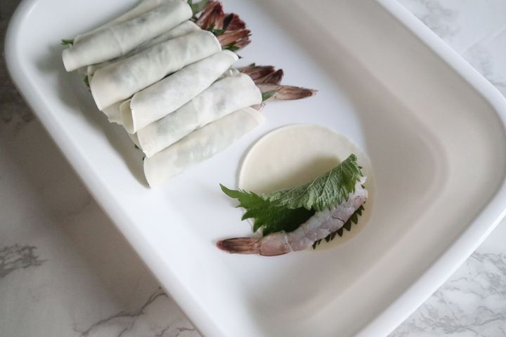 餃子の皮に大葉、海老をのせて巻く。巻き終わりは水をぬってくっつけます。