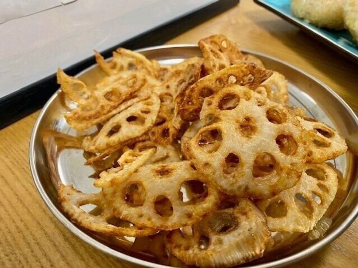 れんこんを薄切りしたものを素揚げして、塩をパラリ。