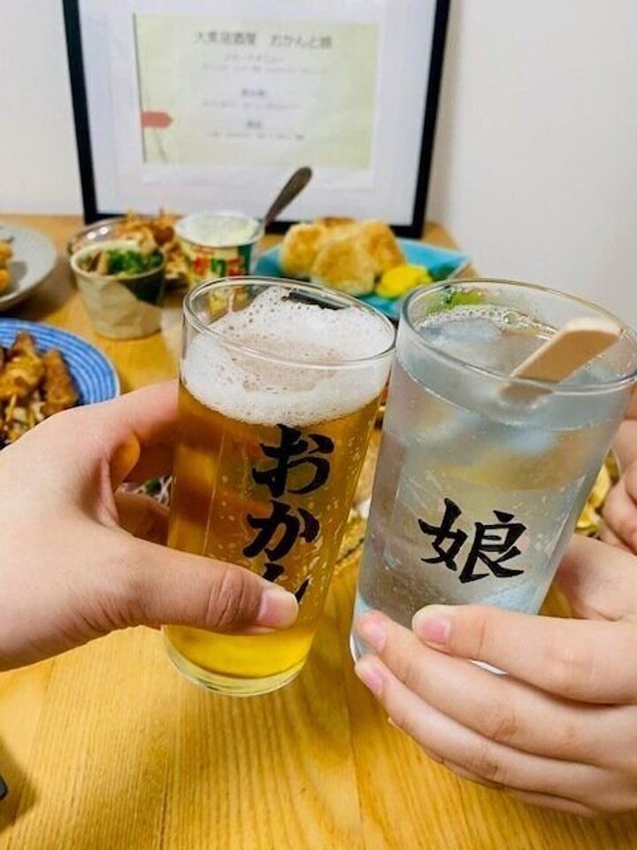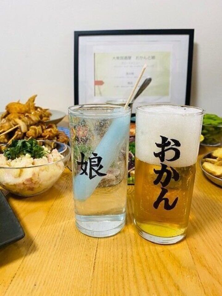 SNSで話題の推しグラスです。本当は自分の推しの名前を書くんですが、今回はおかんグラスと娘グラスに。