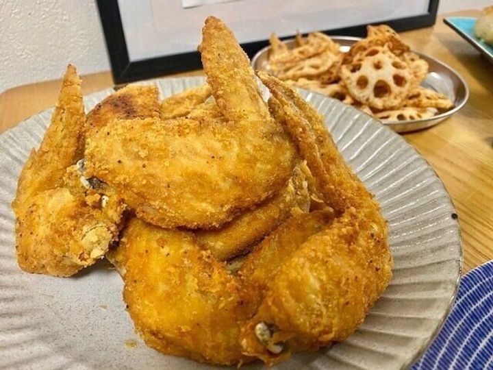手羽中に市販の唐揚げの粉をまぶして30分ほど置きます。あとは油で揚げていきます。普段なら調味料に漬け込むけど、こういう日は市販のものを上手に使って料理のハードルを下げると負担が減ります。