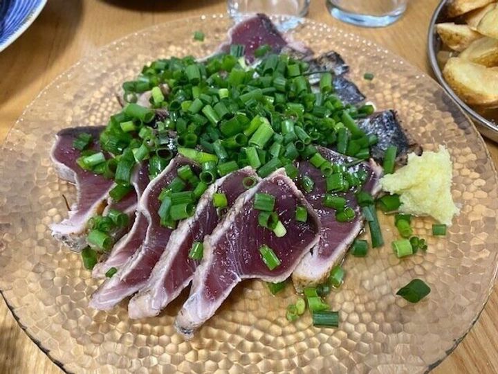 かつおのたたきを切って皿にのせたら小葱、生姜をトッピング。最後にポン酢をかけたら完成。切って盛るだけがラク!