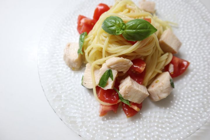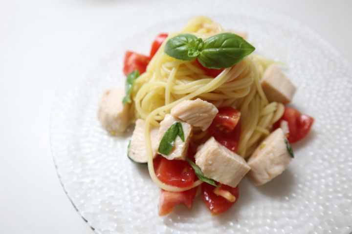 サラダチキンとトマト、バジルの冷製パスタ