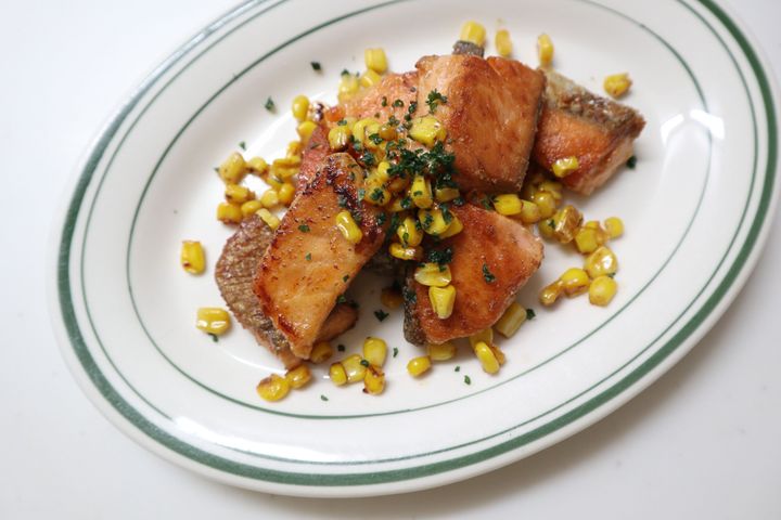 2.中火にかけたフライパンにバターを入れて溶かして、鮭を焼く。こんがり焼き色がついたらひっくり返して、コーンを加える。