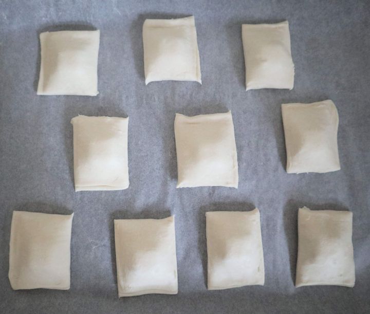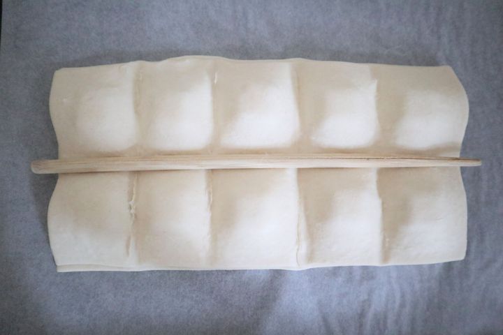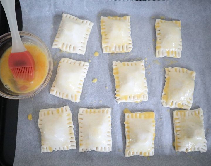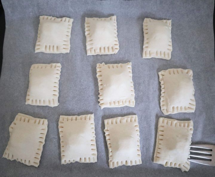 隙間があると焼いたときにそこからチョコが溶け出てしまうので、フォーク押さえて、しっかりくっつけます。