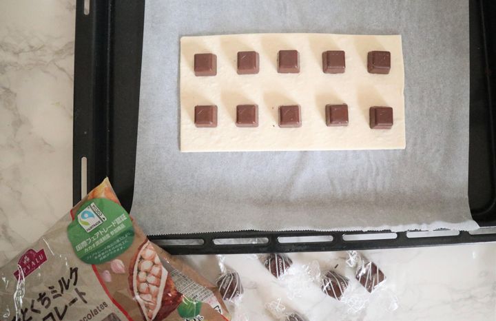 ひとくちミルクチョコと冷凍パイシートを使った簡単アレンジスイーツをご紹介します。