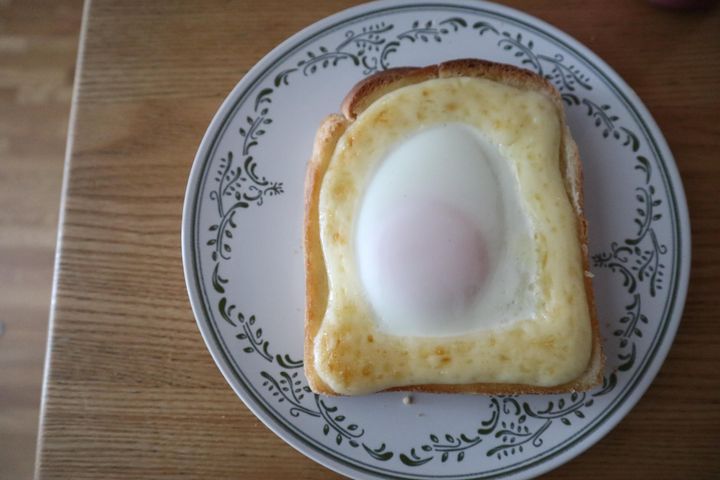 パン・ド・ミのふちにマヨネーズをしぼり、真ん中に卵を落としてトースト。