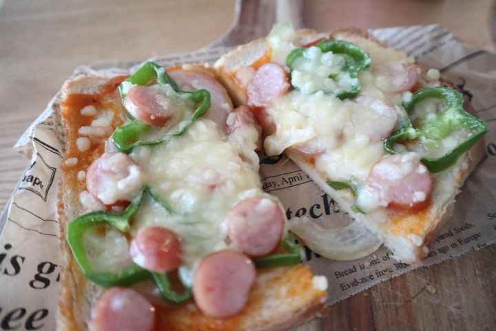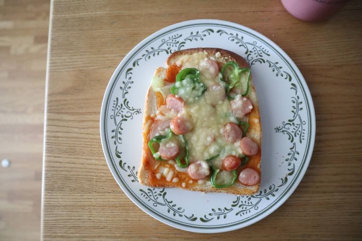 パン・ド・ミにピザソースをぬって、玉ねぎ、ピーマン、ウィンナー、豆乳シュレッドをのせてトーストしました。