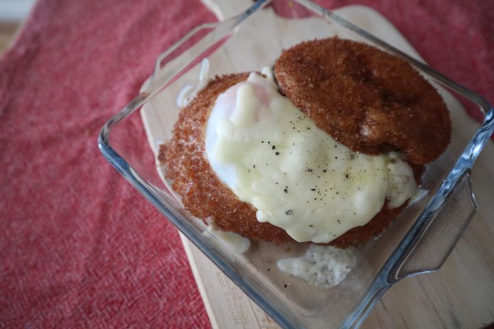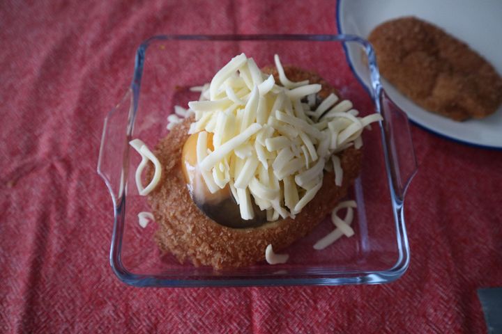 カレーパンの中に卵を落として、チーズをたっぷりのせます。