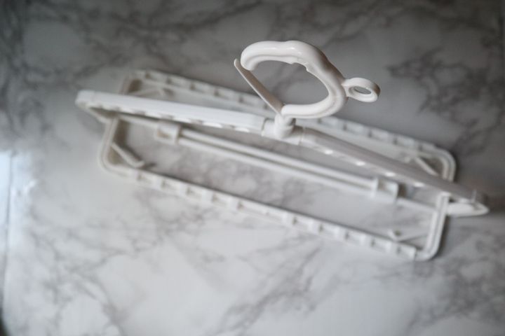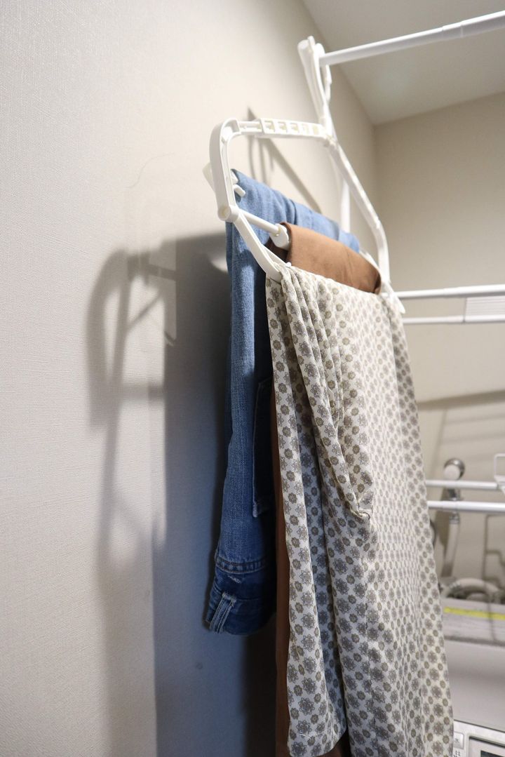 ボトムをかけて、ハンガーを折りたたむと、クローゼット収納もすっきり。